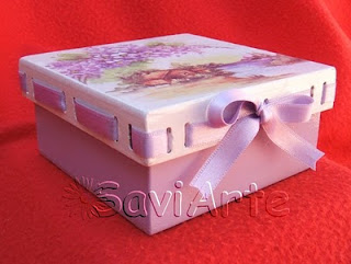 Esta caixa foi pintada com tintas acrílicas branco e rosa. Utilizei algumas aplicações , fiz découpage com relevo e finalizei com um verniz satinado.